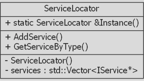 The service locator uses some very hairy template code to register services, or get access to them. The result is an implementation that can be easily expanded and used just by creating new classes that implement the Game Service functionality.