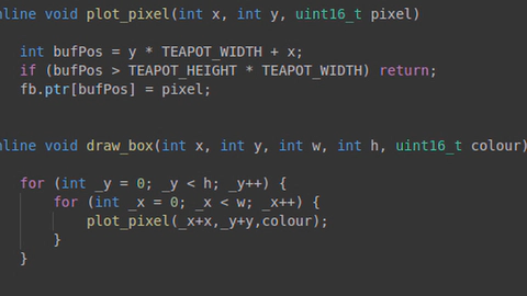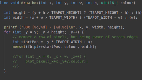 memset() which doesn’t copy data, but will efficiently set data to a specific value. After compiling and running the code, my framerate went up to 42FPS. That’s 12FPS more than the version with the nested for loops, and only 2FPS slower than not drawing anything on the screen.