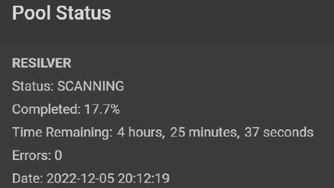 Nobody so much as look funny at the drives, they’re very busy and very very vulnerable right now. If a drive dies during this period of rebuilding, I will lose data, and rebuilding the data thrashes the drives pretty hard for a long time.